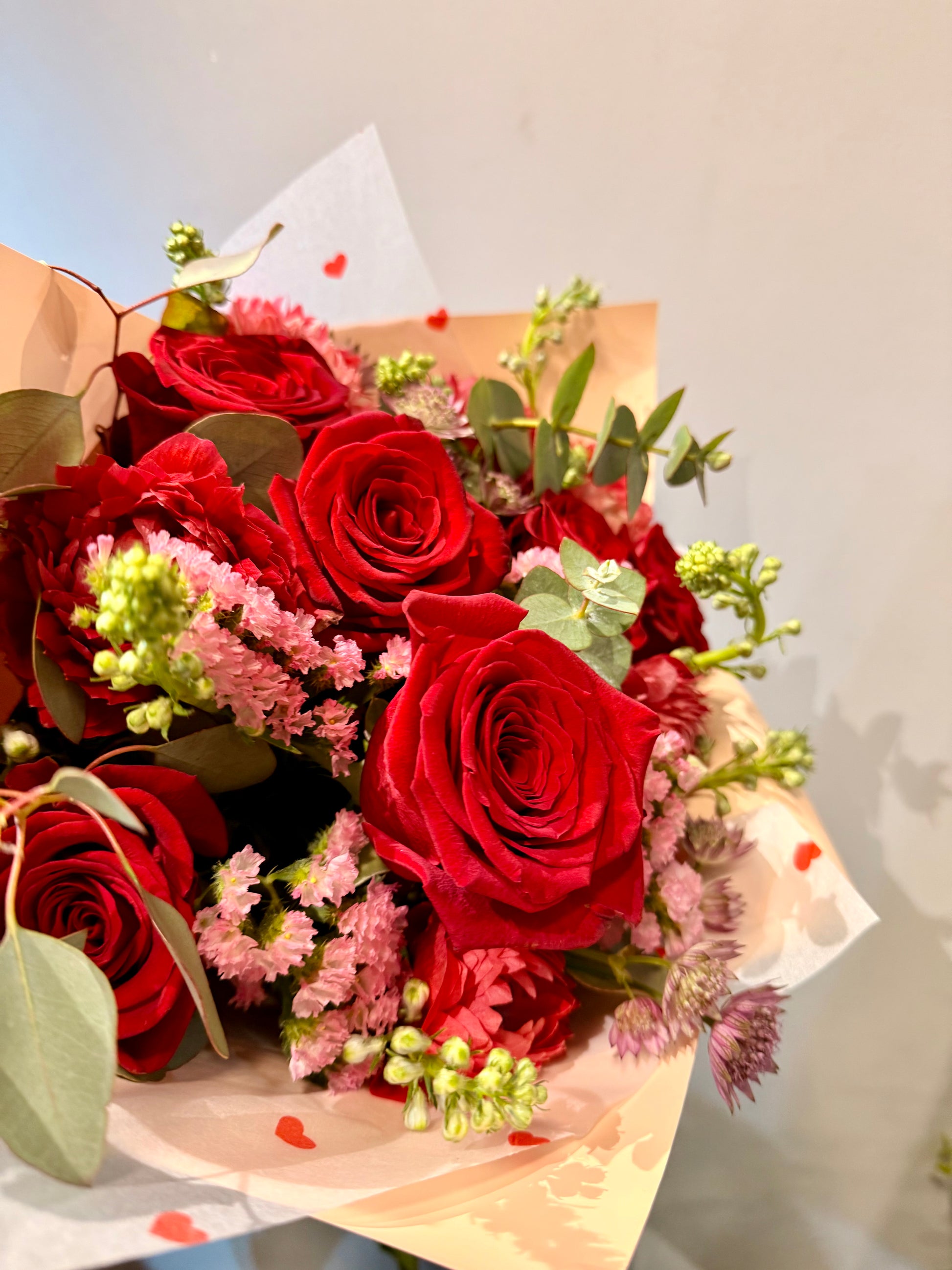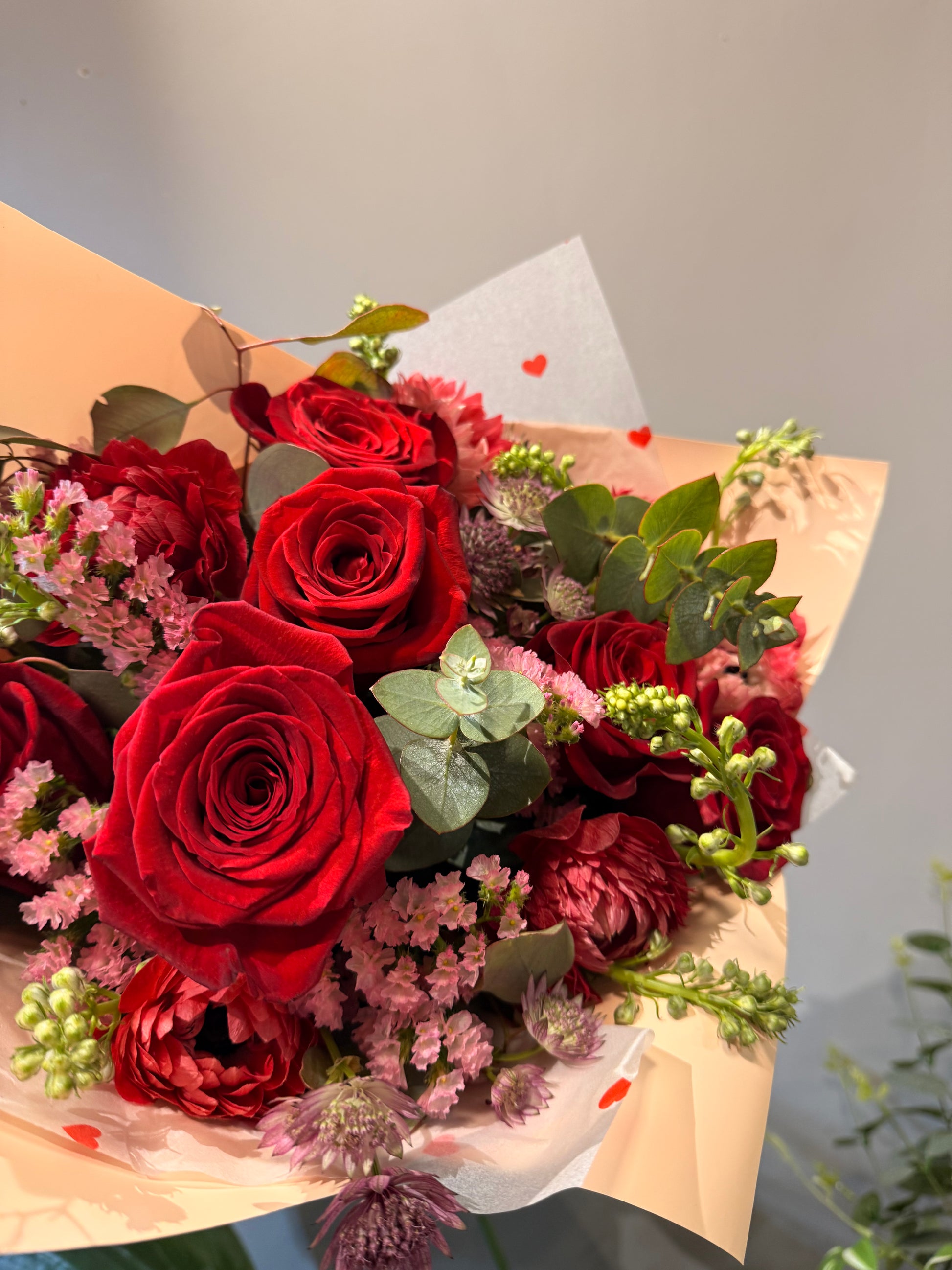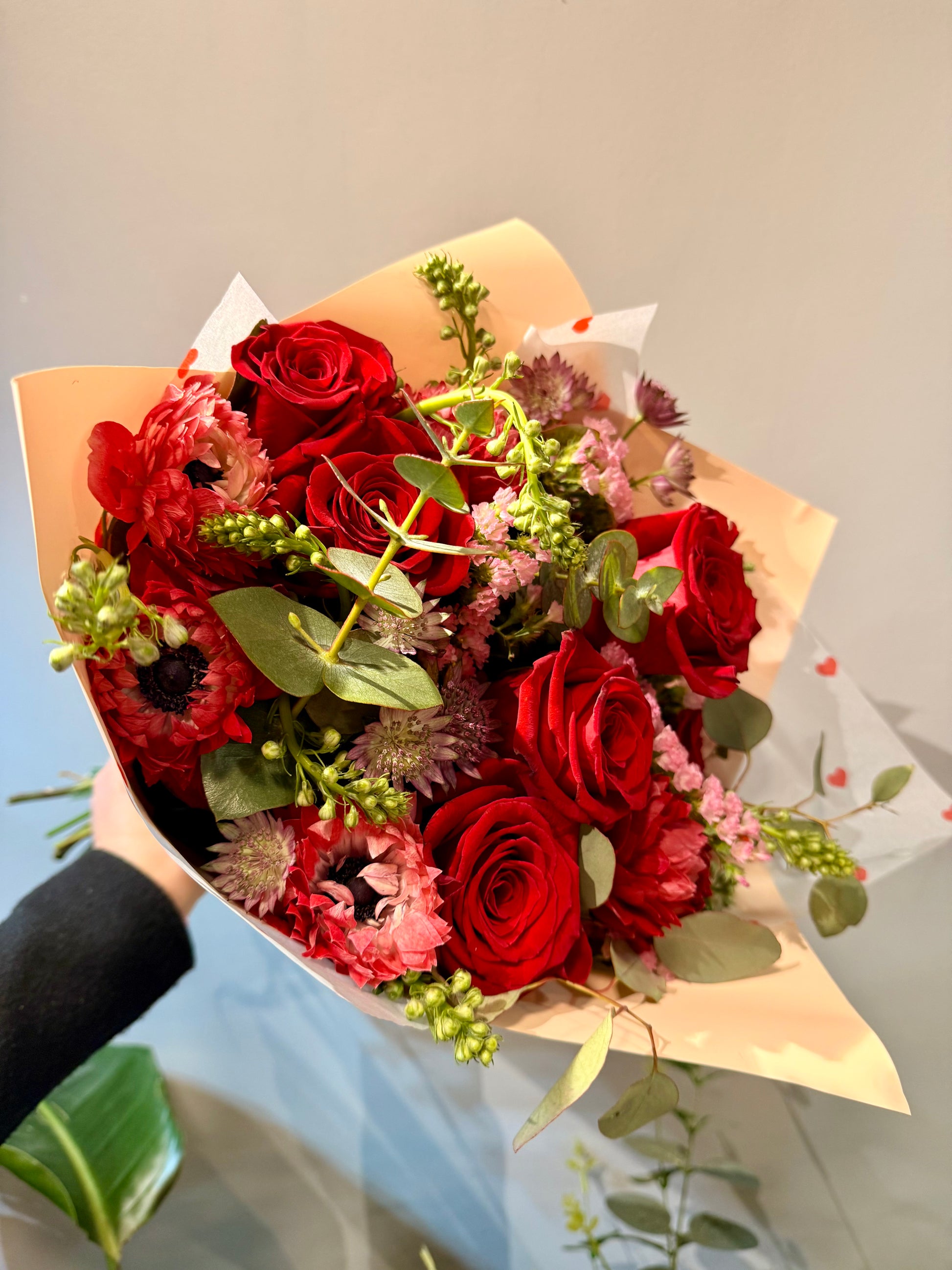 La suavidad de la anémona roja se mezcla con la elegancia atemporal de 5 rosas rojas, envuelta por estatice y astrantias en tonos rosados que aportan textura y un aire casi etéreo.