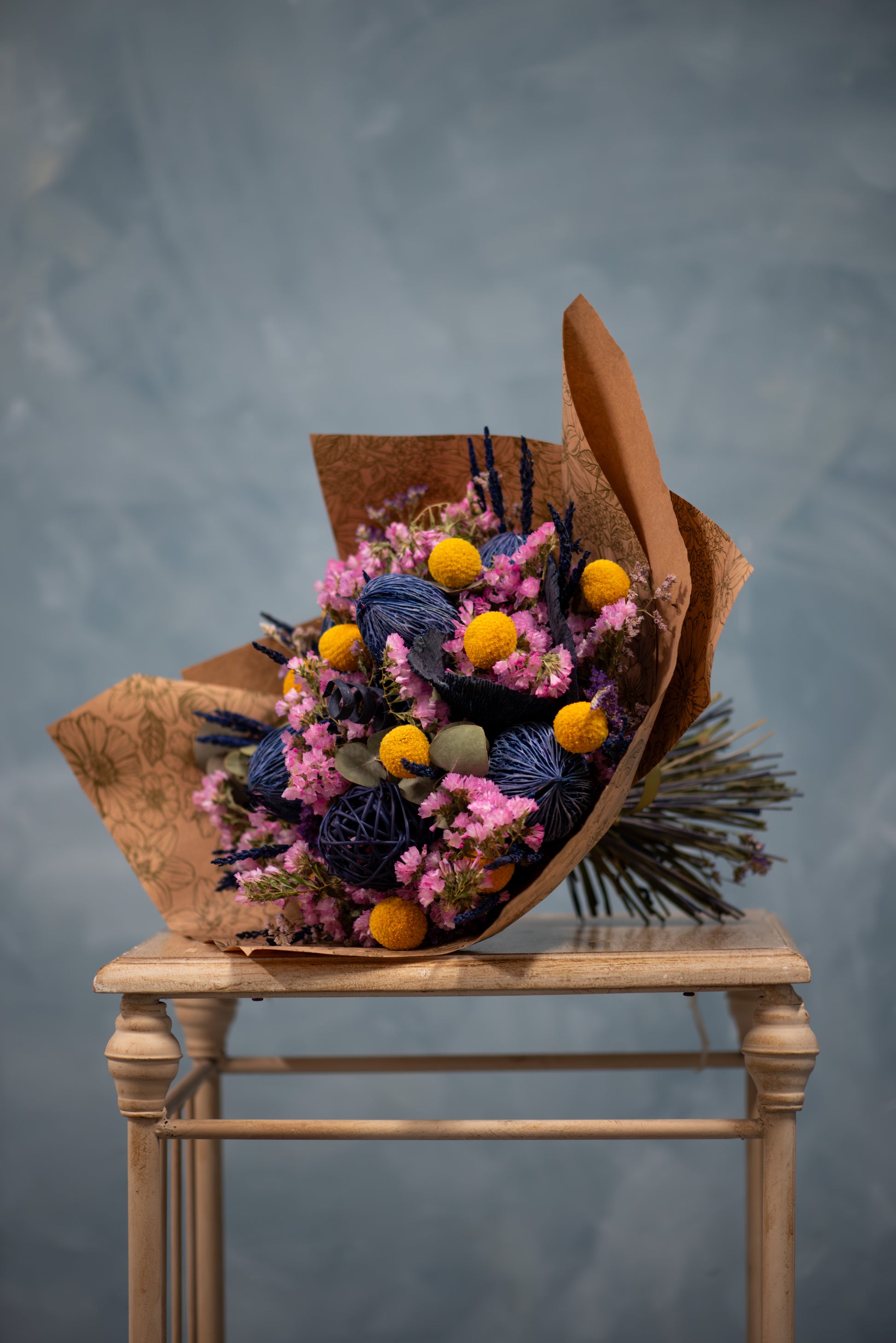Ramo elaborado de forma artesanal con una selección de flores naturales secas y preservadas, pensado para decoración de interiores o como regalo duradero.