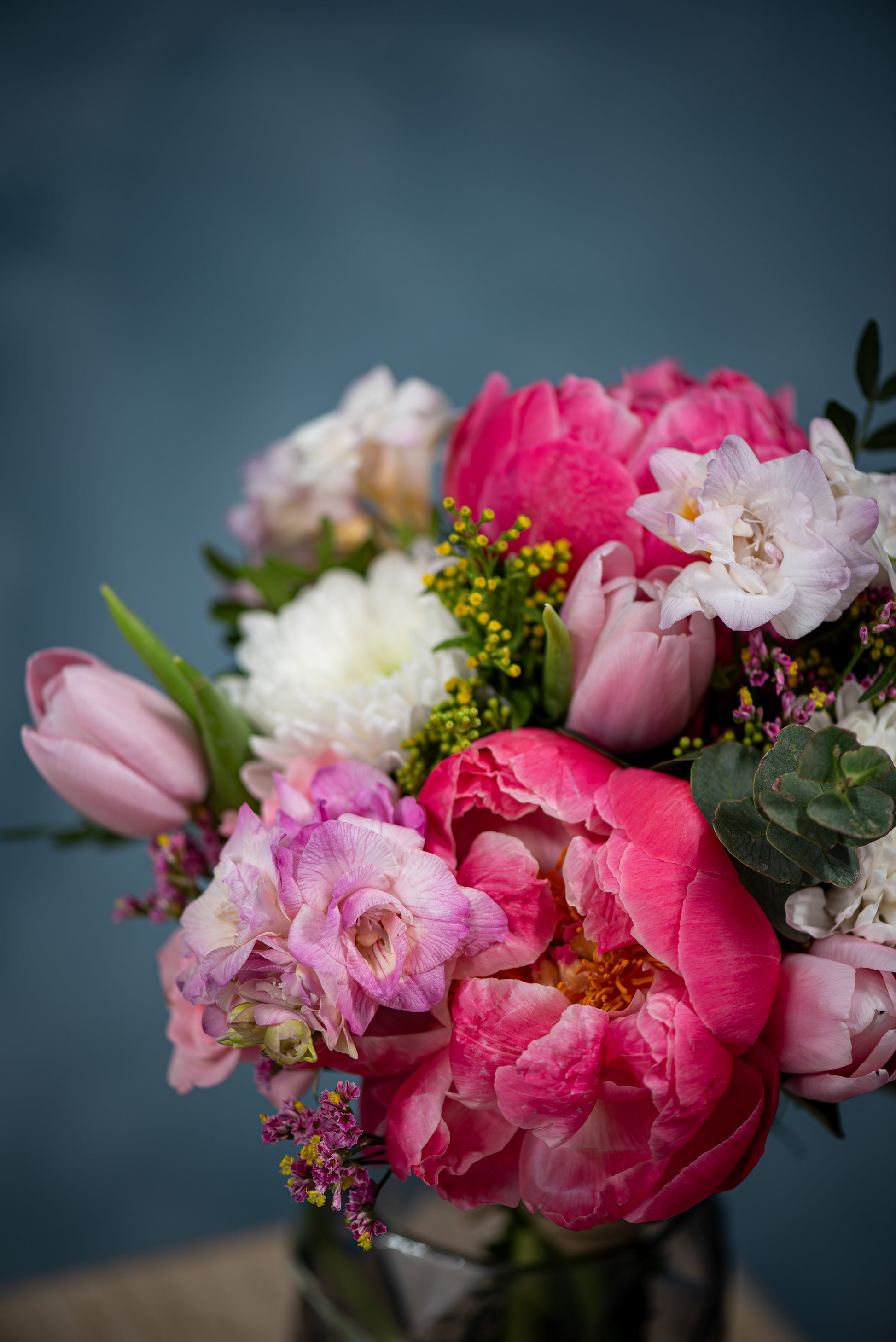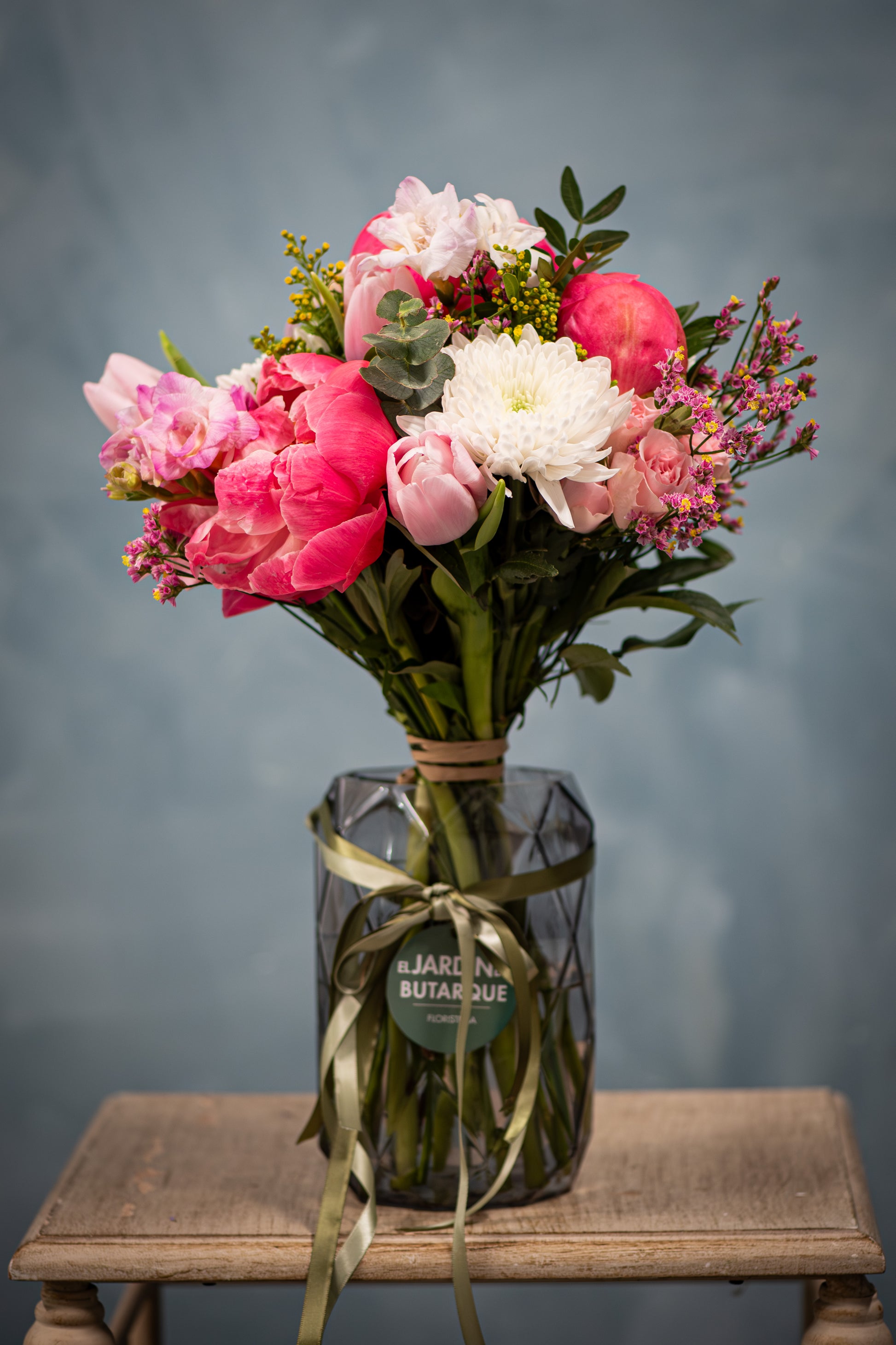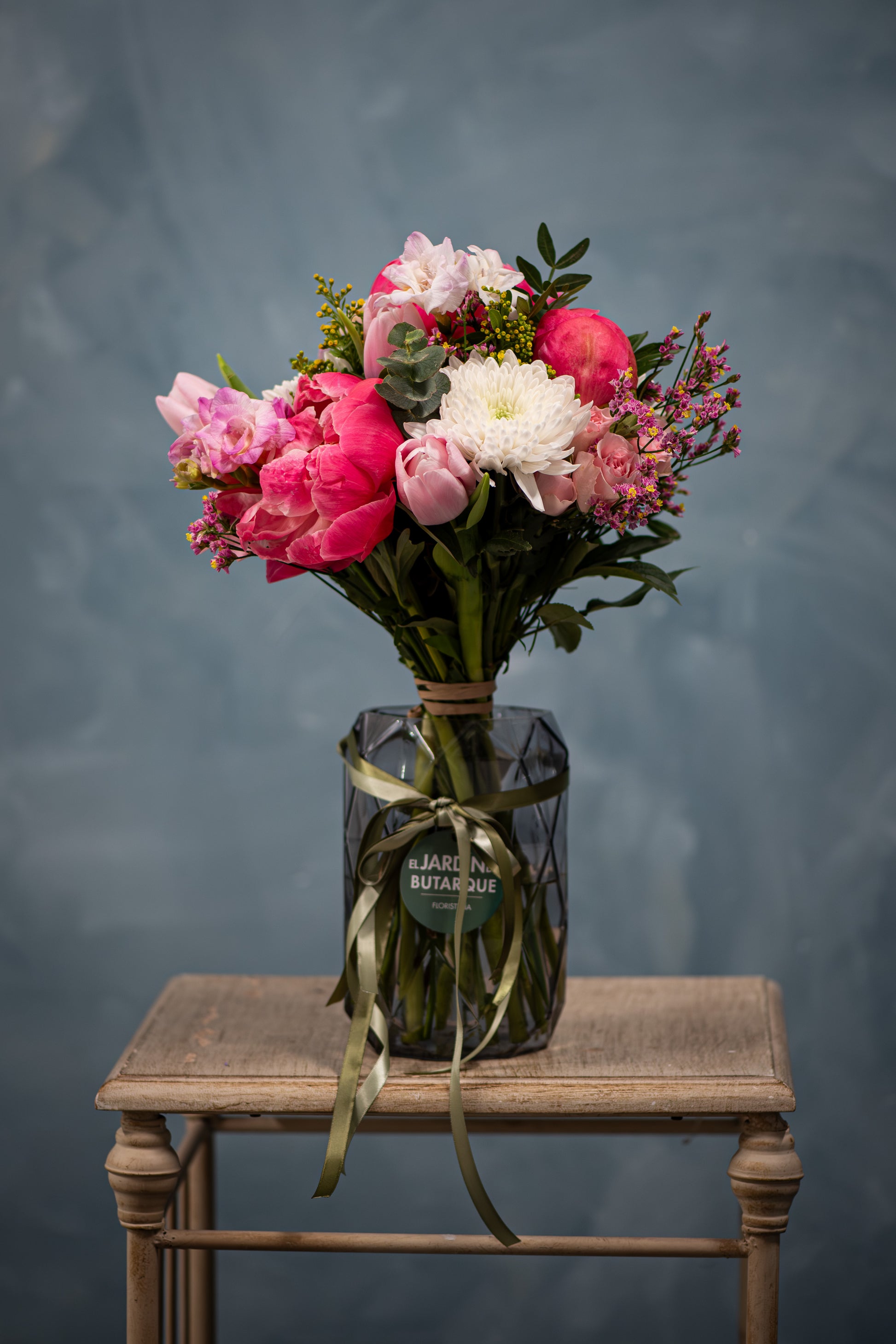 Un ramo elegante y delicado donde la peonía, flor protagonista del Día de la Madre, destaca por su belleza suave y envolvente. Acompañada de rosas spray, anastasias blancas y tulipanes rosas, esta composición crea un equilibrio perfecto entre romanticismo, frescura y luz.