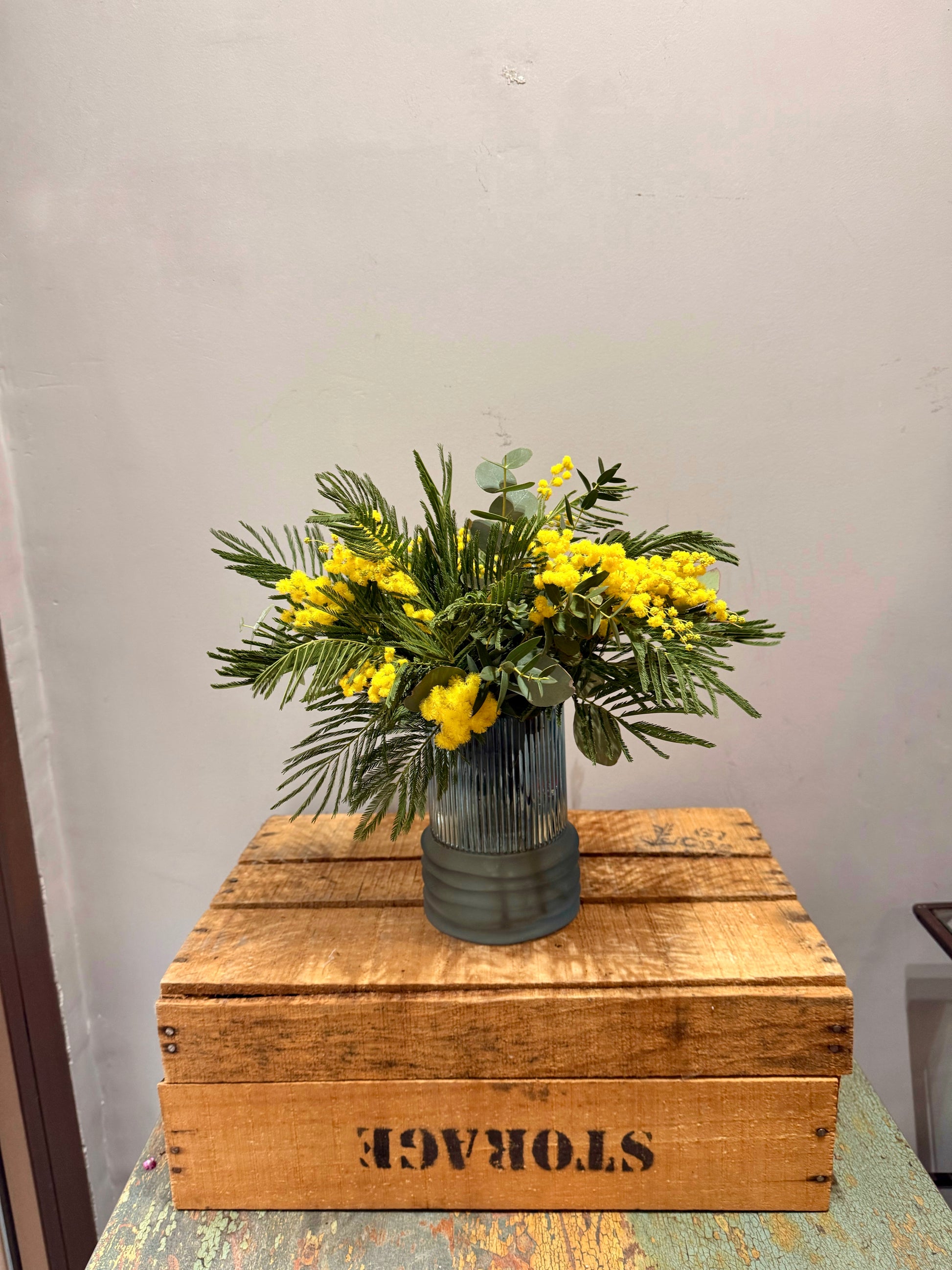 Su fragancia intensa y natural llena el espacio con una sensación fresca y reconfortante, mientras que el amarillo vibrante de la mimosa aporta luz, alegría y una energía contagiosa.